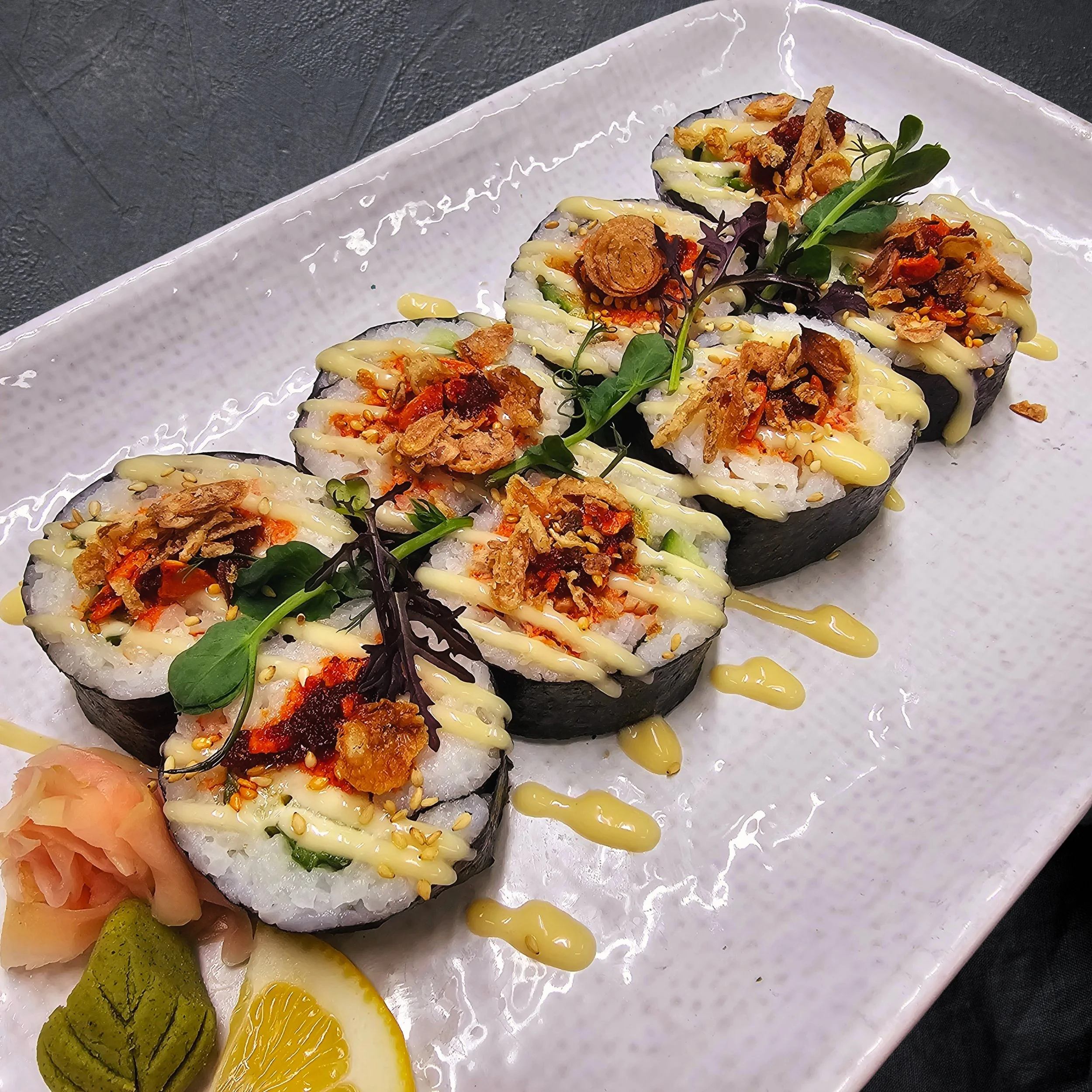 Special Tuna & Cucumber ‘Crunch’ Roll Cooked tuna mayo, cucumber, crunchy garlic & onion, chilli oil & sesame. 4pc $14